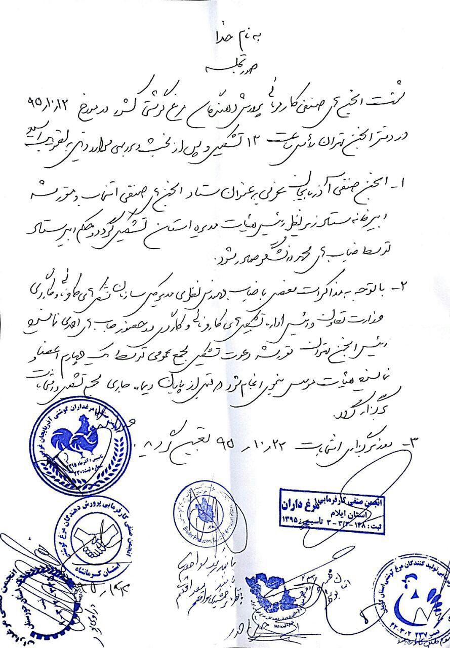 به گزارش پایگاه اطلاع رسانی کشاورزی ایران(اگنا)، در نشست انجمن صنفی کارفرمایی پرورش دهندگان مرغ گوشتی کشور که در تاریخ ۱۲ دیماه ۹۵ در دفتر انجمن تهران برگزار شد، اعضای این انجمن محمد دانشگر، رییس انجمن صنفی آذربایجان غربی را به عنوان رییس ستاد انجمنهای صنفی مرغداران گوشتی کشور برگزیدند.