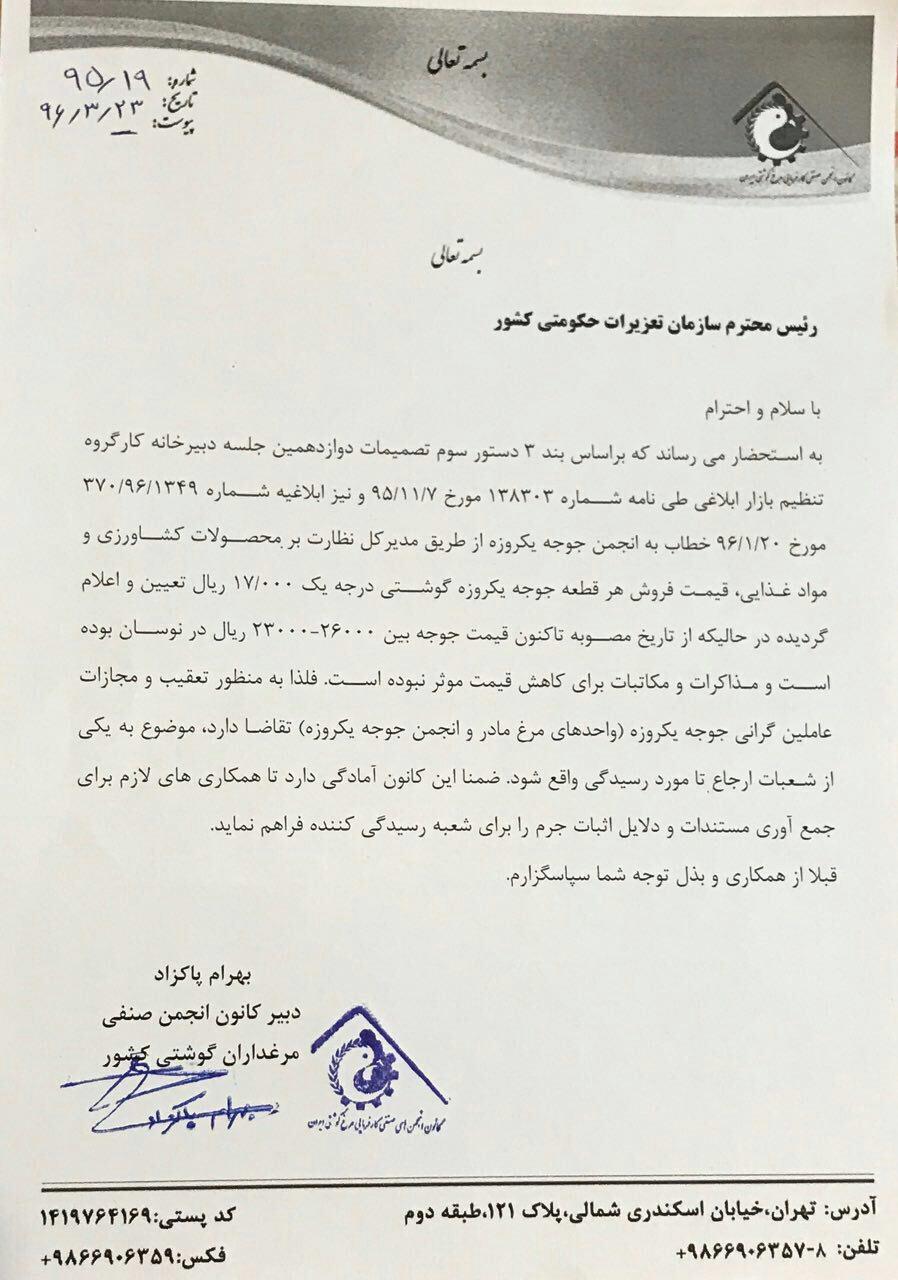 همچنین تولید کنندگان جوجه یکروزه به مصوبات ارگانهای دولتی از جمله ستاد تنظیم بازار، نهاد بازرسی صنعت معدن وتجارت و سازمان حمایت از مصرف کننده و تولید کننده توجه نکرده وموجب ضرر و ورشکستگی مرغداران گوشتی شده، لذا سازمان تعزیرات حکومتی از کانون مستندات خواستار لیست مرغدارانی که از مورخ ۹۵/۱۱/۷ تا ۹۶/۳/۳۱ اقدام به جوجه ریزی با قیمتهای بالای ۱۷۰۰ تومان کرده اند شد.
