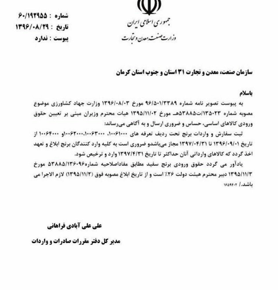 در ابلاغیه جدید وزارت صنعت آمده است: ثبت سفارش و واردات برنج تحت ردیف تعرفه های ۱۰۰۶۱۰۰۰، ۱۰۰۶۳۰۰۰، ۱۰۰۶۲۰۰۰ و ۱۰۰۶۴۰۰۰ از تاریخ ۱۳۹۶/۰۹/۰۱ تا ۱۳۹۷/۰۴/۳۱ مجاز می باشد و ضروری است به کلیه واردکنندگان برنج ابلاغ و تعهد اخذ گردد که کالاهای وارداتی آنها حداکثر تا تاریخ ۱۳۹۷/۰۴/۳۱ وارد و ترخیص شود.
