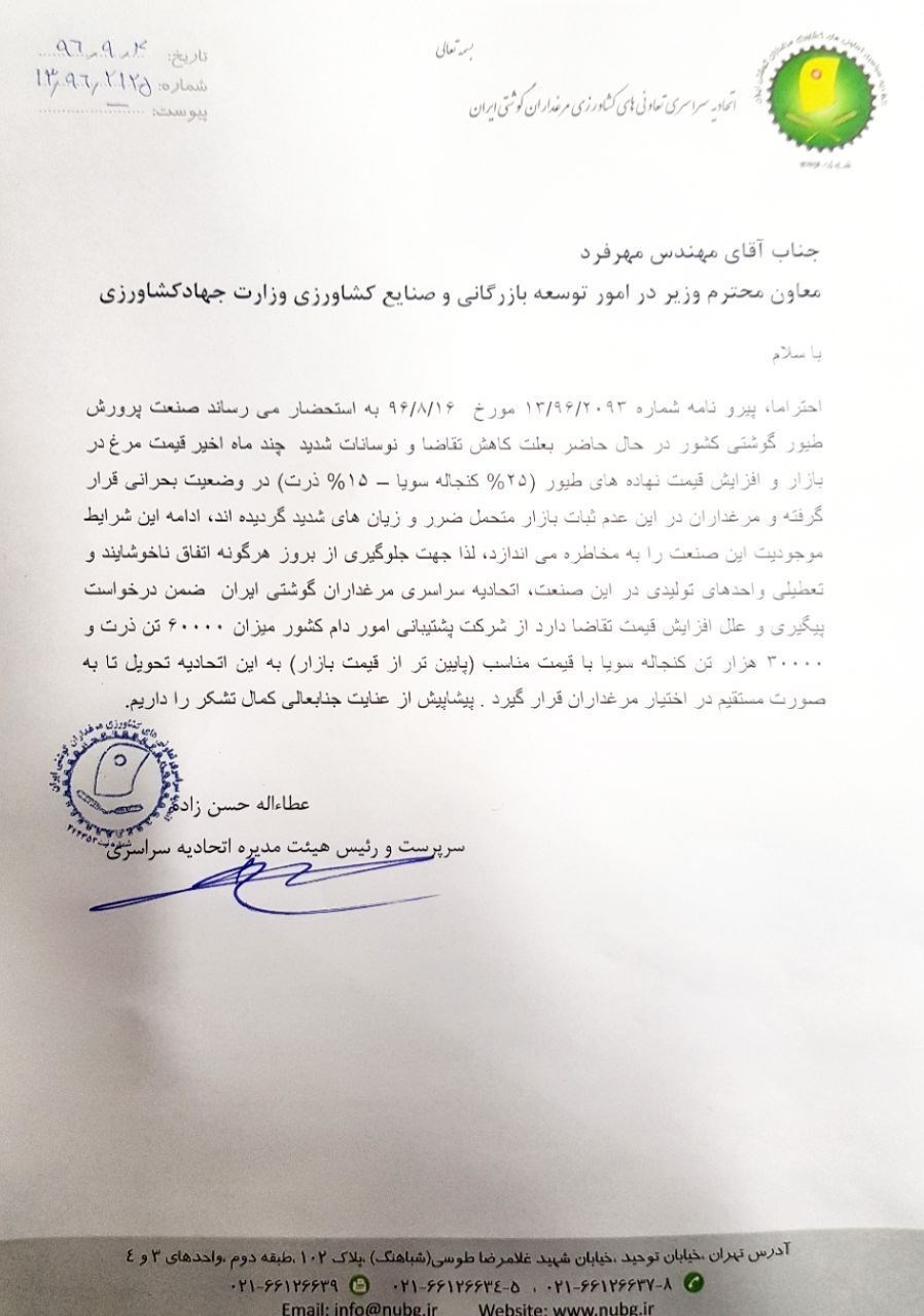 ادامه این شرایط موجودیت این صنعت را به مخاطره میاندازد، لذا جهت جلوگیری از بروز هرگونه اتفاق ناخوشایند و تعطیلی واحدهای تولیدی در این صنعت، اتحادیه سراسری مرغداران گوشتی ایران ضمن درخواست پیگیری و علل افزایش قیمت تقاضا دارد از شرکت پشتیبانی امور دام کشور میزان ۶۰۰۰۰ تن ذرت و ۳۰۰۰۰ تن کنجاله سویا با قیمت مناسب (پایینتر از قیمت بازار) به این اتحادیه تحویل تا به صورت مستقیم در اختیار مرغداران قرار گیرد. پیشاپیش از عنایت جنابعالی کمال تشکر را داریم.»