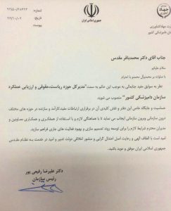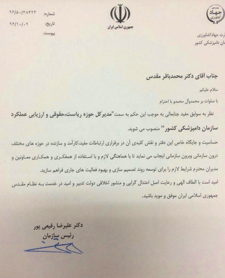 متن حکم انتصاب دکتر محمدباقر مقدس به شرح زیر است: