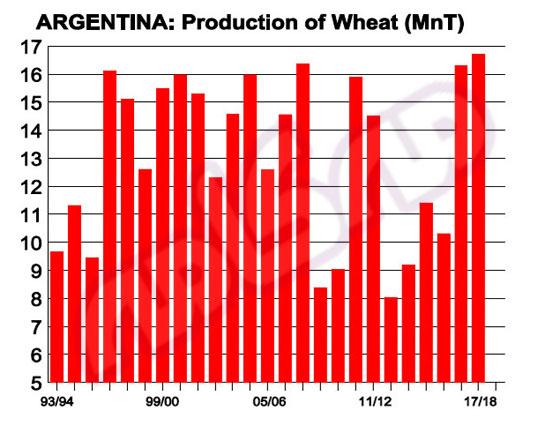 احتمالا در آرژانتین در فصل زراعی ۲۰۱۸-۲۰۱۷ رقم نهایی تولید گندم به حدود ۱۶٫۵ تا ۱۷ میلیون تن برسد که کمی بیشتر فصل قبل و بسیار بالاتر از رقم تولید در متوسط ۱۰ سال گذشته است.