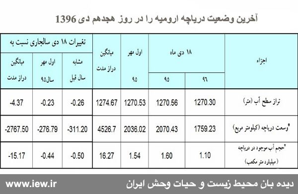 به گزارش پایگاه اطلاع رسانی کشاورزی ایران (اگنا) به نقل از پایگاه خبری دیده بان محیط زیست و حیات وحش ایران (iew): در این گزارش وضعیت دریاچه ارومیه را در روز هجدهم دیماه ۱۳۹۶ از سه شاخص «تراز سطح آب» ، «وسعت دریاچه» و «حجم آب موجود» مورد بررسی قرار می دهیم.