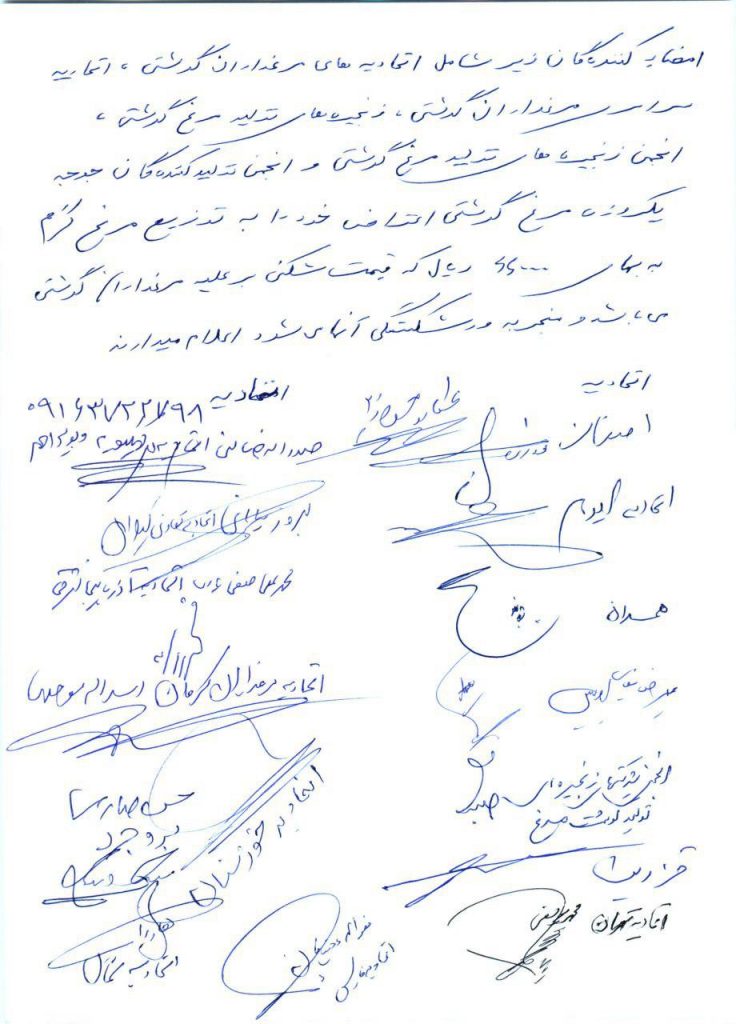 به گزارش پایگاه اطلاع رسانی کشاورزی ایران (اگنا)، در متن این نامه که امضای اتحادیه های مرغداران گوشتی، اتحادیه سراسری مرغداران گوشتی، زنجیره های تولید مرغ گوشتی، انجمن زنجیره های تولید مرغ گوشتی و انجمن تولیدکنندگان جوجه یک روزه مرغ گوشتی را شامل می شود، آمده است: