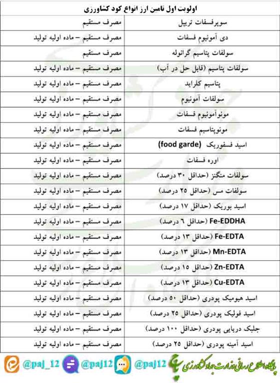 در این اطلاعیه با تاکید بر اهمیت تامین به موقع و کافی کودهای مورد نیاز بخش کشاورزی برای پایداری تولیدات این بخش،اولویت های اول تخصیص ارز انواع کود کشاورزی، به شرح جدول زیر اعلام شده است: