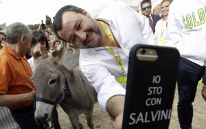 ماتئو سالوینی، وزیر کشور ایتالیا در جریان بازدید از مراسم برگزار شده بوسیله انجمن کشاورزان کولدیرتی در «سیرکوس ماکزیموس» در شهر رم سلفی میگیرد. نوشته روی پوشش تلفن میگوید: «من با سالوینی هستم..»