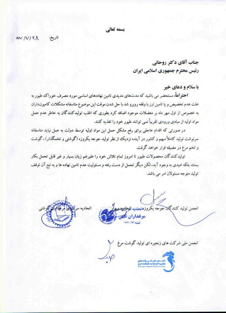 در نامه سرگشاده تشکل های بخش طیور به رییس جمهور مطرح شد: