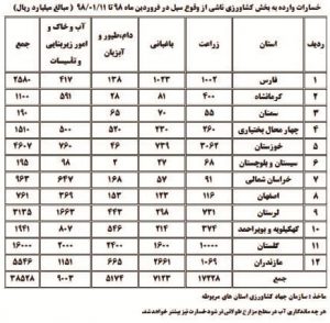 وی ادامه داد: سیل اخیر به زیربخش های زراعت ۱۷ هزار و ۲۲۸ میلیارد ریال، باغبانی ۷۱۲۳ میلیارد ریال، دام و طیور و آبزیان ۵۱۷۴ میلیارد ریال و آب و خاک، امور زیربنایی و تاسیسات استان های گلستان، مازندران، خوزستان، لرستان، فارس، کهگیلویه و بویراحمد، چهارمحال و بختیاری، کرمانشاه، خراسان شمالی، اصفهان، سیستان و بلوچستان و سمنان خسارت زده است.