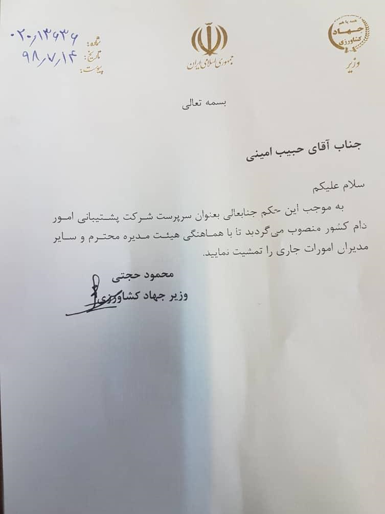 با صدور حکمی از سوی وزیر جهاد کشاورزی، حبیب امینی مدیرکل بازرگانی خارجی شرکت پشتیبانی امور دام با حفظ سمت به عنوان سرپرست شرکت منصوب شد.