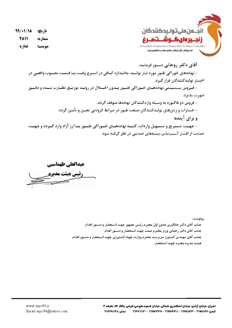 رییس انجمن ملی تولیدکنندگان زنجیره ای گوشت مرغ با ارسال نامه ای به رییس جمهور ضمن درخواست حمایت دولت از تولید در روزهای سخت کرونایی خواستار تسهیل در دسترسی به نهاده های خوراکی طیور مورد نیاز تولید، به اندازه کافی در اسرع وقت با قیمت مصوب واقعی به اختیار تولیدکنندگان شد.