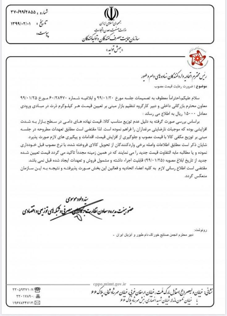 در بخشی از این نامه آمده است: مطابق اطلاعات واصله برخی واردکنندگان از تحویل کالای فروخته شده با نرخ مصوب خودداری نموده و مطالبه ما به التفاوت جدید را می نمایند که در همین زمینه مجددا تاکید می گردد قیمت تعیین شده جدید از تاریخ ابلاغ مصوبه ۹۹.۰۱.۲۵ قابلیت اجرا داشته و مشمول فروش و تعهدات ایجاد شده قبل نمی باشد.