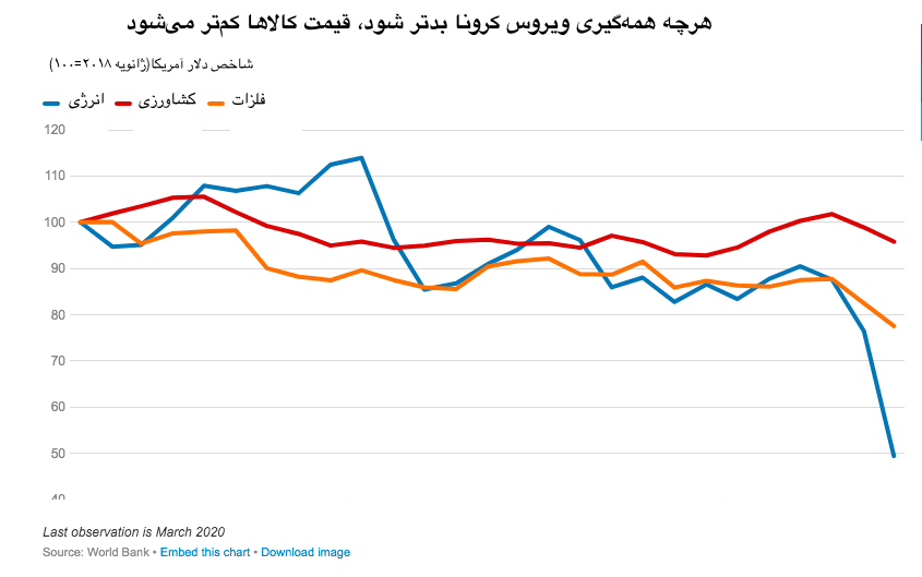قیمت تمام کالاهای «انرژی»، «فلزات» و «کشاورزی» با همهگیری بیماری کووید-۱۹، در سطح جهانی کاهش یافته است.