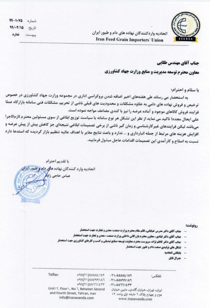 در نامه ای خطاب به معاون توسعه مدیریت و منابع وزارت جهادکشاورزی؛ اعتراض اتحادیه سراسری وارد کنندگان نهاده های دام و طیور نسبت به بروکراسی اداری در وزارت جهاد کشاورزی اتحادیه سراسری واردکنندگان نهادههای دام و طیور در نامه ای رسمی خطاب به مهندس طلایی معاون توسعه مدیریت و منابع وزارت جهادکشاورزی به گسترش بروکراسی […]