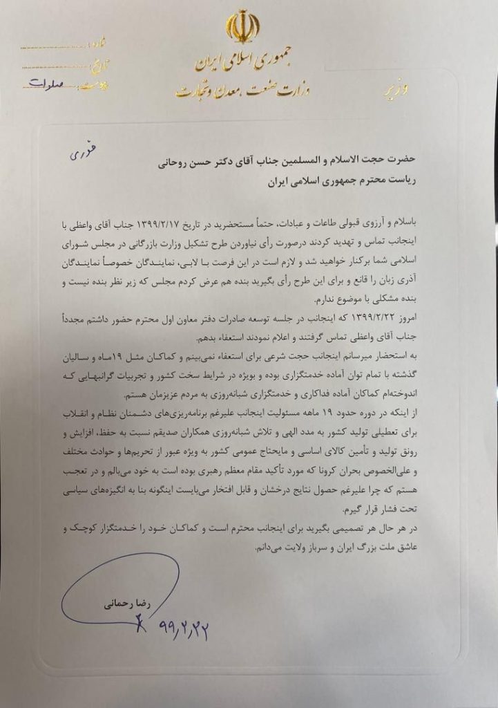 در این نامه خطاب به رئیس جمهور نوشته شده بود: «حتما مستحضرید در تاریخ ۱۷/۲/۱۳۹۹ جناب آقای واعظی(سرپرست نهاد ریاست جمهوری» تماس و تهدید کردند در صورت رای نیاوردن طرح تشکیل وزارت بازرگانی در مجلس شورای اسلامی، شما برکنار خواهید شد و لازم است در این فرصت با لابی، نمایندگان خصوصا نمایندگان آذری زبان را قانع و برای این طرح رای بگیرید بنده هم عرض کردم مجلس که زیر نظر بنده نیست و مشکلی با موضوع ندارم.