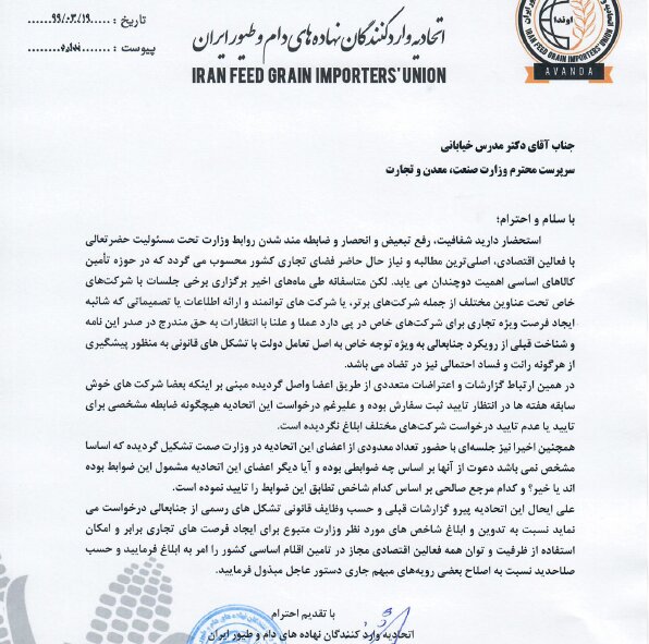 اتحادیه واردکنندگان نهادههای دام و طیور در نامهای به سرپرست وزارت صنعت، معدن و تجارت خواستار ایجاد شفافیت، رفع تبعیض و انحصار در حوزه ثبت سفارش و واردات نهادههای دامی شدند.