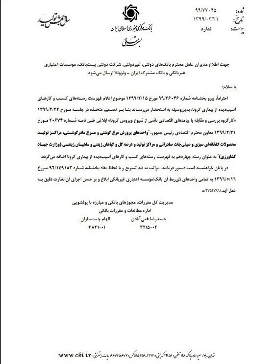 بانک مرکزی لیست مشاغل و کسب و کارهای حوزه جهاد کشاورزی که جدیدا مشمول دریافت تسهیلات حمایتی در برابر شیوع ویروس کرونا شده اند را به بانک ها ابلاغ کرد.