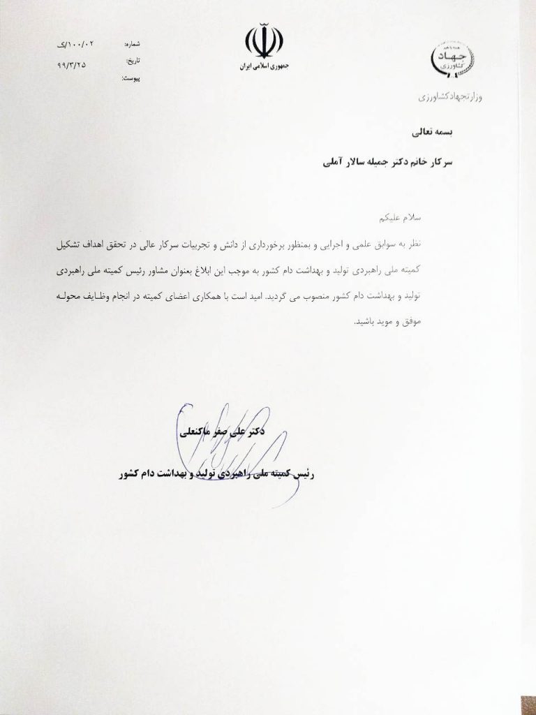 در حاشیه دومین نشست کمیته ملی راهبردی تولید و بهداشت دام کشور خانم جمیله سالار آملی بعنوان مشاور رییس کمیته انتخاب و معرفی گردید.