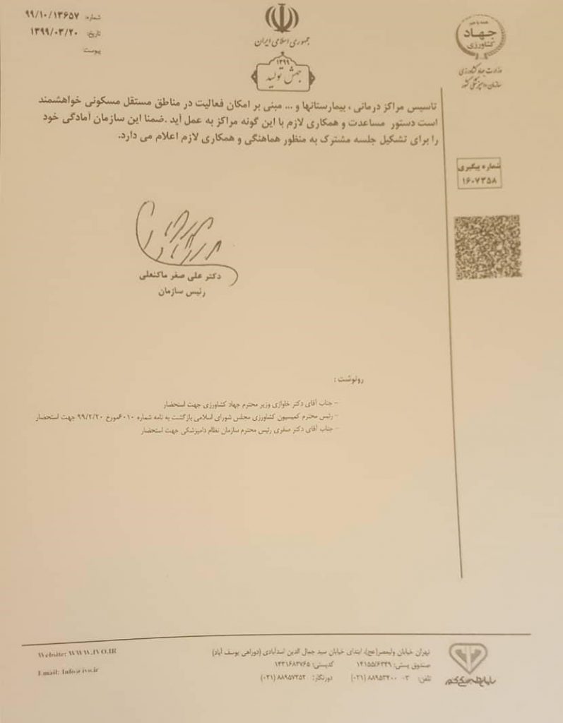 با عنایت به جلسه برگزار شده در کمیسیون کشاورزی، آب و منابع طبیعی و محیط زیست مجلس شورای اسلامی به تاریخ ۹۸/۱۰/۲۹ با حضور نمایندگان سازمانهای ذیربط از جمله شهرداری محترم تهران و تصمیمات متخذه مندرج در صورتجلسه و با توجه به ابلاغ شیوهنامه مربوط به تاسیس مراکز درمانی، بیمارستانها و … مبنی بر امکان فعالیت در مناطق مستقل مسکونی خواهشمند است دستور مساعدت و همکاری لازم با این گونه مراکز به عمل آید.