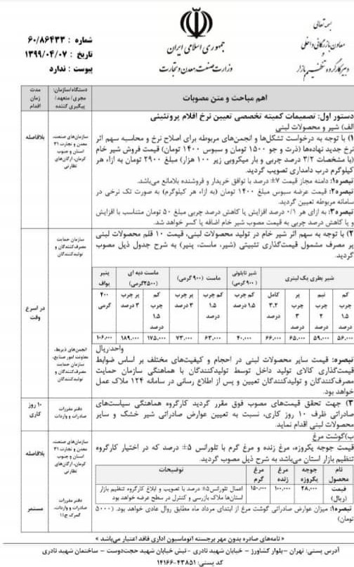 ۱) با توجه به درخواست تشکلها و انجمنهای مربوطه برای اصلاح نرخ و محاسبه سهم اثر نرخ جدید نهاه ها (ذرت و جو ۱۵۰۰ تومان و سبوس ۱۴۰۰ تومان) و قیمت فروش شیرخام با مشخصات ۳٫۲ درصد چربی و بار میکروبی زیر ۱۰۰ هزار مبلغ ۲۹۰۰ تومان به ازای هر کیلوگرم درب دامداری تصویب گردید.