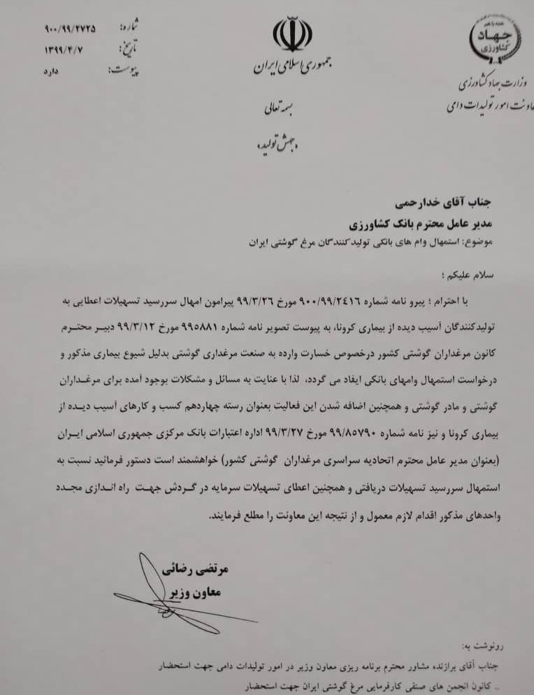 با احترام پیرو نامه ۲۶ خرداد سال جاری پیرامون امهال سررسید تسهیلات اعطایی به تولیدکنندگان آسیب دیده از بیماری کرونا، تصویر نامه دبیر کانون مرغداران گوشتی کشور در خصوص خسارت وارده به صنعت مرغداری گوشتی به دلیل شیوع بیماری مذکور و درخواست استمهال وام های بانکی گردد؛ لذا با عنایت به مسائل و مشکلات به وجود آمده برای مرغداران گوشتی و مادر گوشتی و همچنین اضافه شدن این فعالیتها به عنوان بسته چهاردهم کسب و کارهای آسیب دیده از بیماری کرونا و نیز نامه اداره اعتبارات بانک مرکزی جمهوری اسلامی ایران (به عنوان مدیر عامل محترم اتحادیه سراسری) خواهشمند است دستور فرمایید نسبت به استمهال تسهیلات دریافتی، همچنین اعطای تسهیلات سرمایه در گردش جهت راه اندازی مجدد واحدهای مذکور اقدام لازم معمول و از نتیجه این معاونت را مطلع فرمایید.