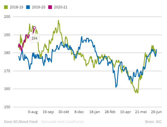 به گزارش واحد بین المللی پایگاه اطلاع رسانی کشاورزی ایران (اگنا) به نقل از نشریه آل ابوت فید؛ شاخص قیمت سویای شورای بین المللی غلات (IGC) که در ۱۰ اوت سال ۲۰۲۰ در نقطه ۱۸۷ ایستاده بود، دوشنبه گذشته با صعود مداوم خود را به نقطه ۱۹۴ رساند، یعنی همان سطحی که در اکتبر ۲۰۱۸ بود. این افزایش قیمت به طور عمده مربوط به درخواست های فراوان و آسیب های احتمالی طوفان Drecho است که به مزارع سویا در ایالات متحده آسیب رساند.