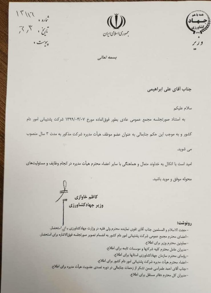 به استناد صورتجلسه مجمع عمومی عادی بطور فوق العاده مورخ ۹۹/۴/۷ شرکت پشتیبانی امور دام کشور و به موجب این حکم جنابعالی بعنوان عضو موظف هیات مدیره شرکت مذکور به مدت ۳ سال منصوب می شوید.
