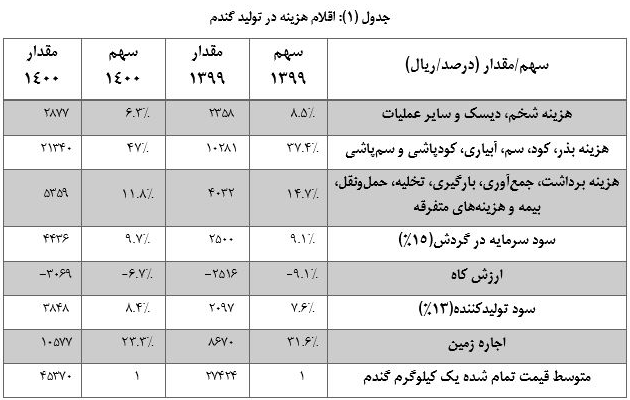 همان طور که از جدول مشخص است، با حذف ارز ترجیحی، سهم سود تولیدکننده در قیمت تمام شده گندم در سال ۱۴۰۰ نسبت به سال ۹۹ افزایش مییابد.