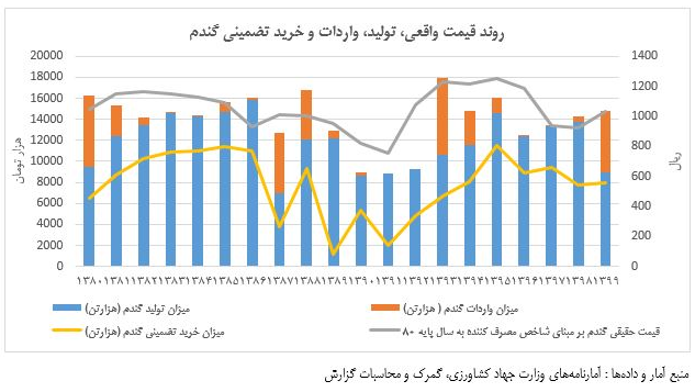 در حالی که میزان خرید تضمینی دولت در سالهای ابتدایی دهه ۸۰ نسبتاً زیاد بوده است و همین مسأله، رشد تولید گندم در سالهای بعدی را در پی داشته است. باید توجه داشت که کاهش تولید گندم در سالهای انتهایی دهه ۸۰ (۸۷ به بعد)، هم تحت تاثیر کاهش قیمت حقیقی تضمینی گندم در سال ۸۶ و هم ناشی از خشکسالی آن سالها بوده است. [۱]