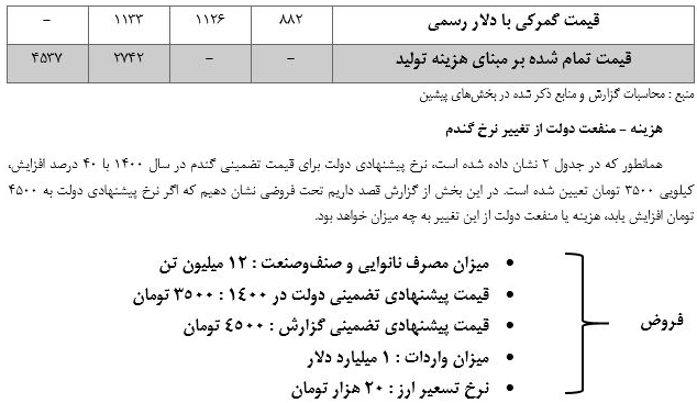 • میزان مصرف نانوایی و صنفوصنعت : ۱۲ میلیون تن • قیمت پیشنهادی تضمینی دولت در ۱۴۰۰ : ۳۵۰۰ تومان • قیمت پیشنهادی تضمینی گزارش : ۴۵۰۰ تومان • میزان واردات : ۱ میلیارد دلار • نرخ تسعیر ارز : ۲۰ هزار تومان]