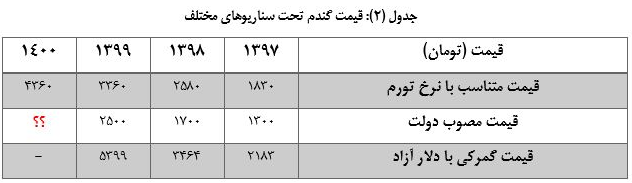 در جدول شماره ۲ قیمتهای تضمینی مصوب دولت و قیمتهایی که بر مبنای قانون خرید تضمینی محاسبه شدهاند (متناسب با تعدیل تورمی و هزینههای تولید) و همچنین قیمت گمرکی (با دلار آزاد و رسمی) یک کیلوگرم گندم برای سالهای ۹۷ تا ۱۴۰۰ نشان داده شده است.