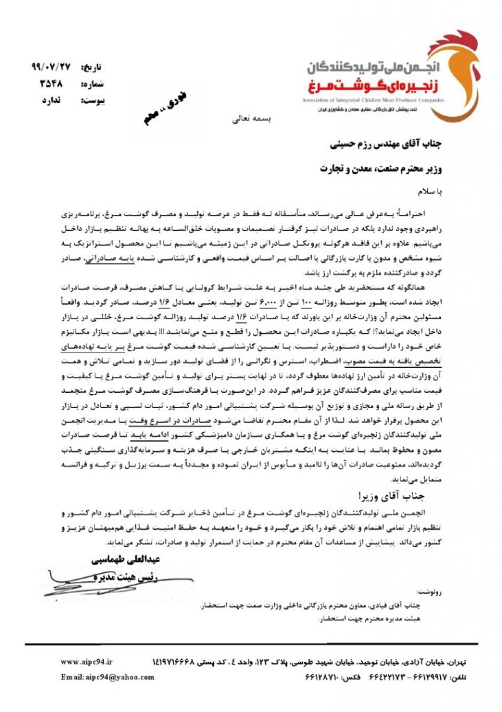 همانگونه که مستحضرید طی چند ماه اخیر به علت شرایط کرونایی با کاهش مصرف، فرصت صادرات ایجاد شده است، بهطور متوسط روزانه ۱۰۰تن از ۶٫۰۰۰ تن تولید، یعنی معادل ۱٫۶ درصد، صادر گردید. واقعاً مسئولین محترم آن وزارتخانه بر این باورند که صادرات ۱٫۶ درصد تولید روزانه گوشت مرغ، خللی در بازار داخل ایجاد مینماید؟! که یکباره صادرات این محصول را قطع و منع مینمایند؟!!. بدیهی است بازار مکانیزیم خاص خود را داراست و دستورپذیر نیست. با تعیین کارشناسی شده قیمت گوشت مرغ بر پایه نهادههای تخصیصیافته به قیمت مصوب، اضطراب، استرس و نگرانی را از فضای تولید دور سازید و تمامی تلاش و همت آن وزارتخانه در تأمین ارز نهادهها معطوف گردد، تا درنهایت بستر برای تولید و تأمین گوشت مرغ با کیفیت و قیمت مناسب برای مصرفکنندگان عزیز فراهم گردد. در این صورت با فرهنگسازی مصرف گوشت مرغ منجمد از طریق رسانه ملی و مجازی و توزیع آن بهوسیله شرکت پشتیبانی امور دام کشور، ثبات نسبی و تعادل در بازار این محصول برقرار خواهد شد. لذا، از آن مقام محترم تقاضا میشود صادرات در اسرع وقت با مدیریت انجمن ملی تولیدکنندگان زنجیرهای گوشت مرغ و با همکاری سازمان دامپزشکی کشور ادامه یابد تا فرصت صادرات مصون و محفوظ بماند. با عنایت به اینکه مشتریان خارجی با صرف هزینه و سرمایهگذاری سنگینی جذب گردیدهاند، ممنوعیت صادرات آنها را ناامید و مأیوس از ایران نموده و مجدداً به سمت برزیل و ترکیه و فرانسه متمایل مینماید.