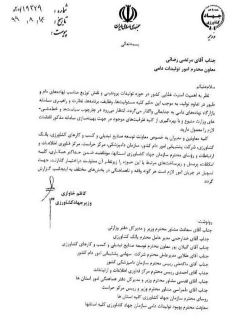کلیه معاونین و مدیران بهخصوص معاونت توسعه صنایع تبدیلی و کسبوکارهای کشاورزی، بانک کشاورزی، شرکت پشتیبانی امور دام کشور، سازمان دامپزشکی، مرکز حراست، مرکز فناوری اطلاعات و ارتباطات و رؤسای محترم سازمان جهاد کشاورزی استانها، موظفند ضمن حداکثر همکاری، کلیه امکانات، پرسنل و زیرساختهای مرتبط با این حوزه را زیرنظر آن معاونت در اختیار گذارند. جهت تسهیل در جریان امور لازم است هرگونه وقفه و ناهماهنگی در بخشهای مختلف به اینجانب گزارش گردد.