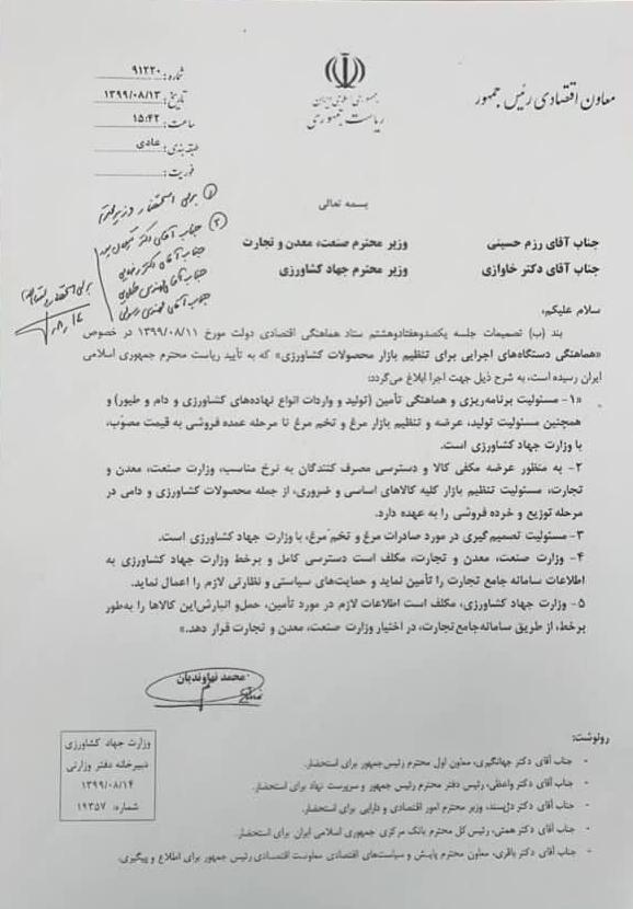 همچنین تصمیمگیری در خصوص صادرات مرغ و تخم مرغ هم به وزارت جهاد کشاورزی واگذار شده است.
