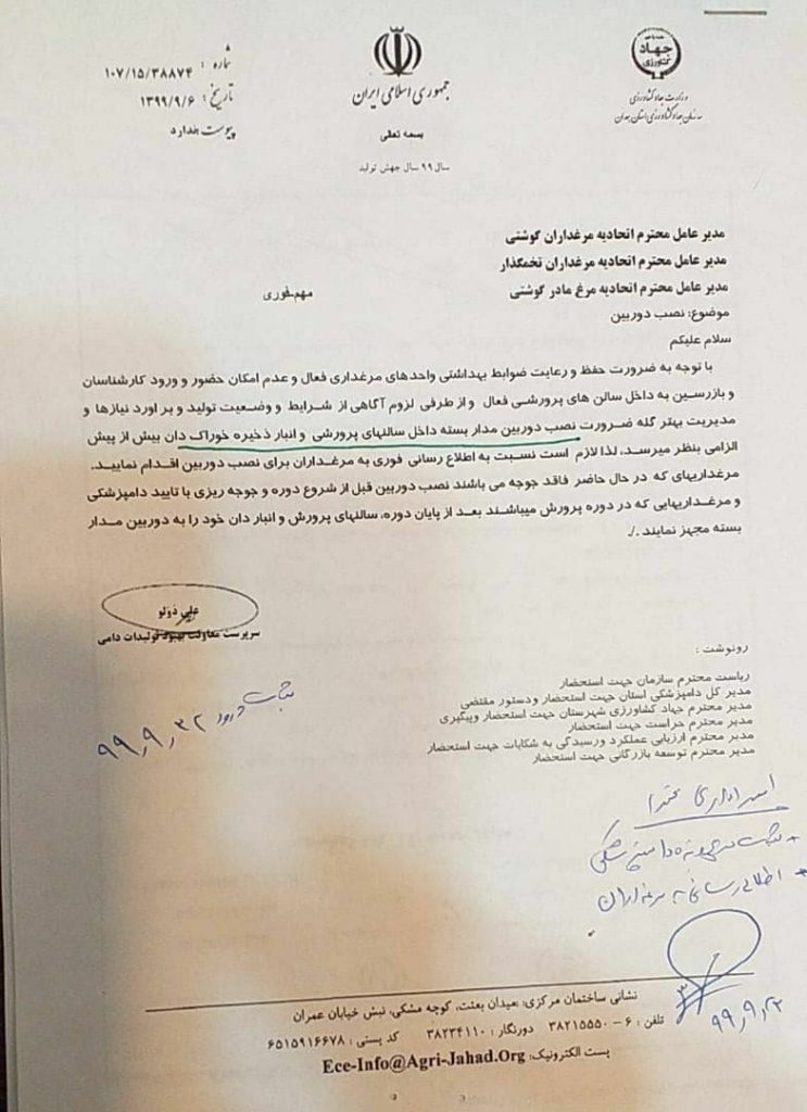 در این نامه مرغداری های فاقد جوجه، نصب دوربین قبل از جوجه ریزی و مرغداری های در دوره پرورش بعد از پایان دوره با تایید دامپزشکی ملزم به این کار شدند.
