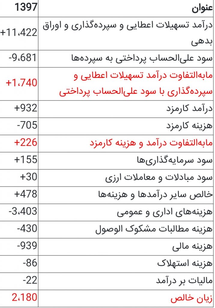 باوجود سود مثبت ۱۷۴۰ میلیارد تومانی بانک کشاورزی در بخش درآمدهای مشاع و سود مثبت ۲۰۶ میلیارد تومانی این بانک در بخش کارمزد، در پایان سال ۹۷ این بانک زیان ۲۱۸۰ میلیارد تومانی را ثبت کرده است.