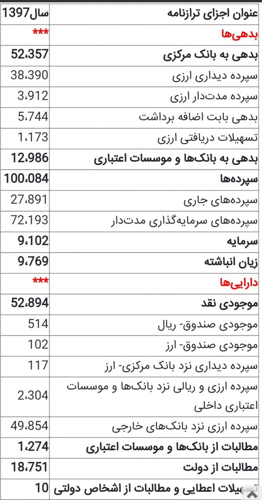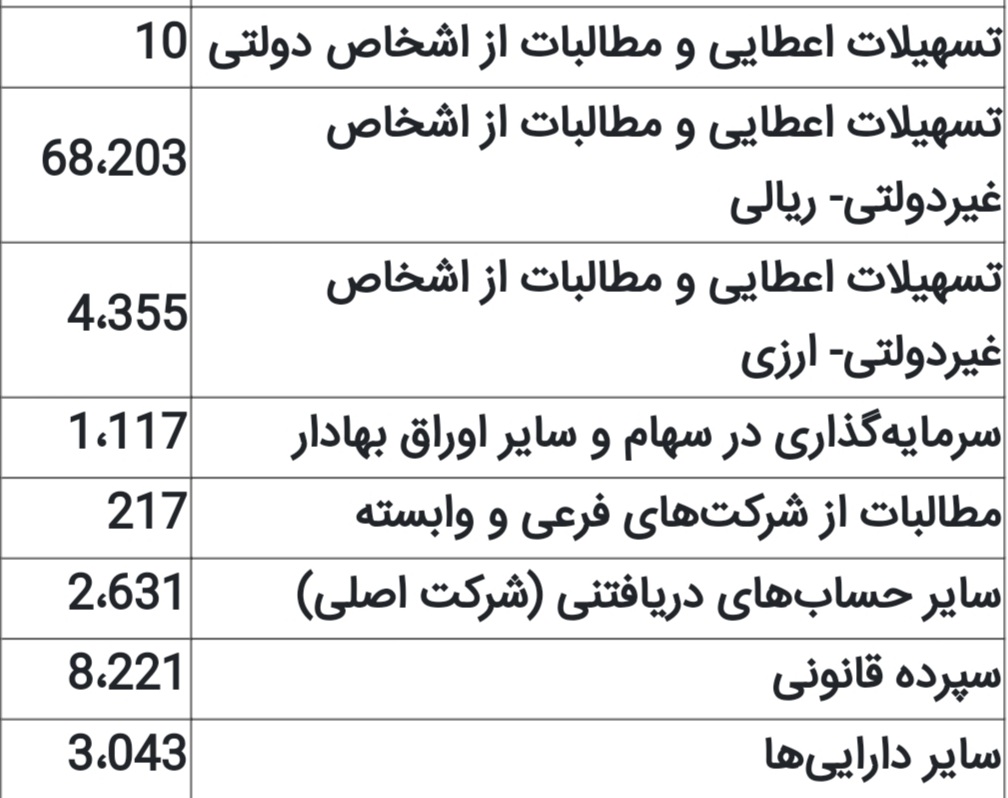 مجموع تسهیلات اعطایی به بخش دولتی و غیردولتی، موجود نقد ریالی، سپرده نزد بانک مرکزی، مطالبات از شرکتهای فرعی و وابسته و سپرده قانونی و حسابهای دریافتنی و مطالبات واقعی از دولت به رقم ۹۴ هزار و ۴۵۳ میلیارد تومان میرسد.
