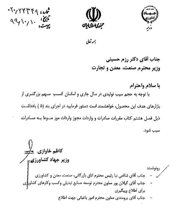 وزیر جهاد کشاورزی در نامهای به وزیر صنعت، معدن و تجارت، خواستار مجوز واردات موز در ازای صادرات سیب درختی شد.