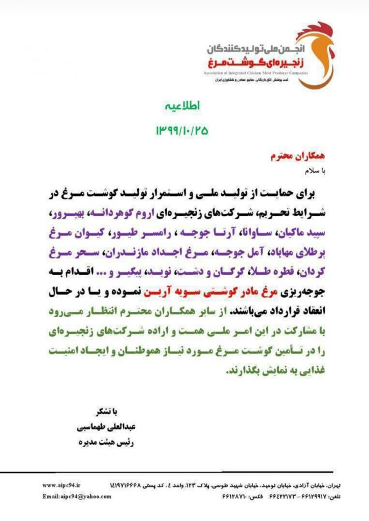 « از همکاران محترم انتظار میرود با مشارکت در این امر ملی، همت و ارادۀ شرکتهای زنجیرهای را در تأمین گوشت مرغ مورد نیاز هموطنان و ایجاد امنیت غذایی به نمایش بگذارند.»