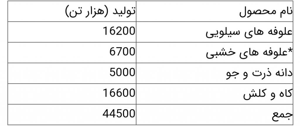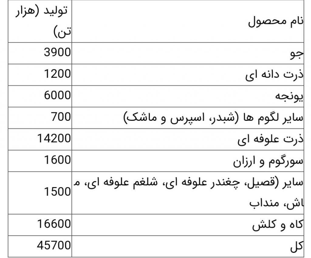 جدول۲- مقدار تولید محصولات علوفه ای به تفکیک در سال زراعی ۱۳۹۹