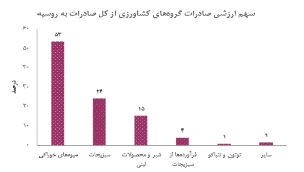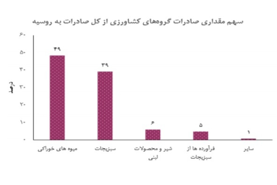 او ادامه میدهد: «صادرات ایران به روسیه در ۸ ماهه نخست سال جاری در بخش کشاورزی بالغ بر۳۵۲٫۵ هزار تن معادل ۲۴۹ میلیون دلار بوده است محصولات صادر شده به ترتیب رتبه ارزش صادراتی شامل سیب، هلو و شلیل و شفتالو، پسته، انواع آلبالو، کیوی، رب گوجه فرنگی، فلفل فرنگی، انگور، انواع خرما، سیر، گوجه فرنگی و هندوانه بوده است.»