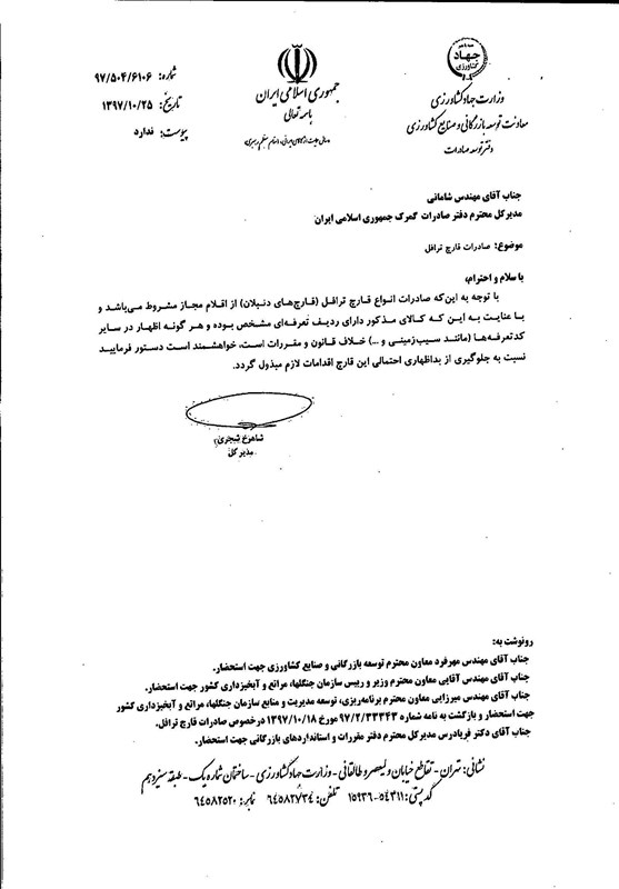 در نامه شاهرخ شجری مدیرکل معاونت توسعه بازرگانی و صنایع کشاورزی وزارت جهاد کشاورزی: