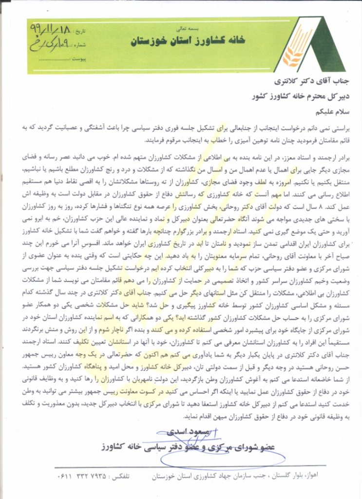 جناب آقای دکتر کلانتری به شما یادآوری می کنم که هم اکنون که حضرتعالی در یک وجه معاون رئیس جمهور هستید و در وجه دیگر دبیر کل خانه کشاورز و محل امید و پناهگاه کشاورزان کشور هستید از شما خاضعانه استدعا می کنم به آغوش وطن بازگردید، این دولت نامهربان را رها کنید و به وظیفه خود در دفاع از حقوق کشاورزان عمل نمایید.