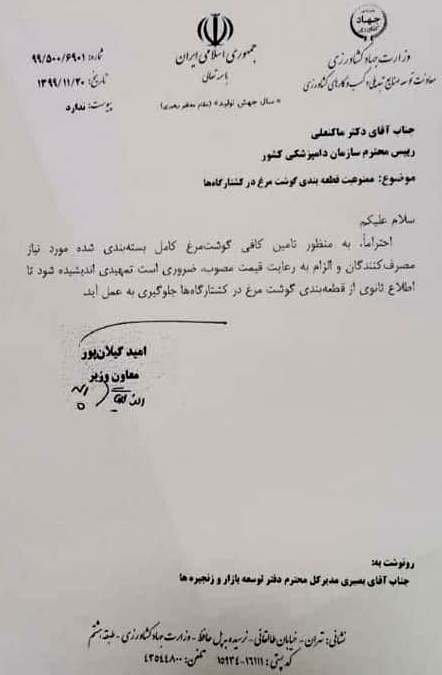 به گزارش پایگاه اطلاع رسانی کشاورزی ایران (اگنا):به نقل ازمهر، در پی نامه معاون توسعه صنایع تبدیلی و کسب و کارهای کشاورزی وزارت جهاد کشاورزی به رئیس سازمان دامپزشکی کشور مبنی بر ممنوعیت قطعهبندی گوشت مرغ در کشتارگاهها تا اطلاع ثانوی، رئیس سازمان دامپزشکی نیز در نامهای به ادارات کل دامپزشکی سراسر کشور این ممنوعیت را ابلاغ کرد.