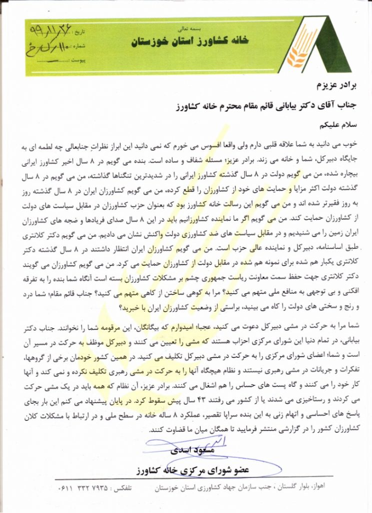 به گزارش پایگاه اطلاع رسانی کشاورزی ایران (اگنا)؛به نقل از دهقان نیوز، بدنبال نامه مسعود اسدی عضو شورای مرکزی خانه کشاورز به دکتر کلانتری دبیرکل خانه کشاورز پیرامون تشکیل جلسه فوری دفتر سیاسی به منظور اتخاذ تدابیری در حمایت از کشاورزان و بدنبال آن نامه ای دیگر از سوی اسدی خطاب به کلانتری پیرامون اینکه یا طبق وظیفه دبیرکل، از کشاورزان مظلوم ایران زمین دفاع کنید یا استعفا دهید شاهد پاسخ قائم مقام خانه کشاورز به اسدی بودیم، نامه ای که دکتر بیابانی در آن به اسدی تاکید کرده بود که در مشی دبیرکل حرکت کن و از کاه، کوه نساز. در همین خصوص مسعود اسدی در پاسخ به نامه صادر شده از سوی قائم مقام خانه کشاورز، در نامه ای خطاب به وی نوشت: