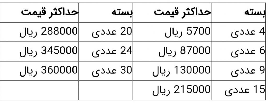 قیمت تخم مرغ بسته بندی شده در ۷ نوع بسته اعلام و قیمت های ۵۷۰۰ تومان تا ۳۶ هزار تومان برای بسته های ۴ عددی تا ۳۰ عددی تعیین شد.
