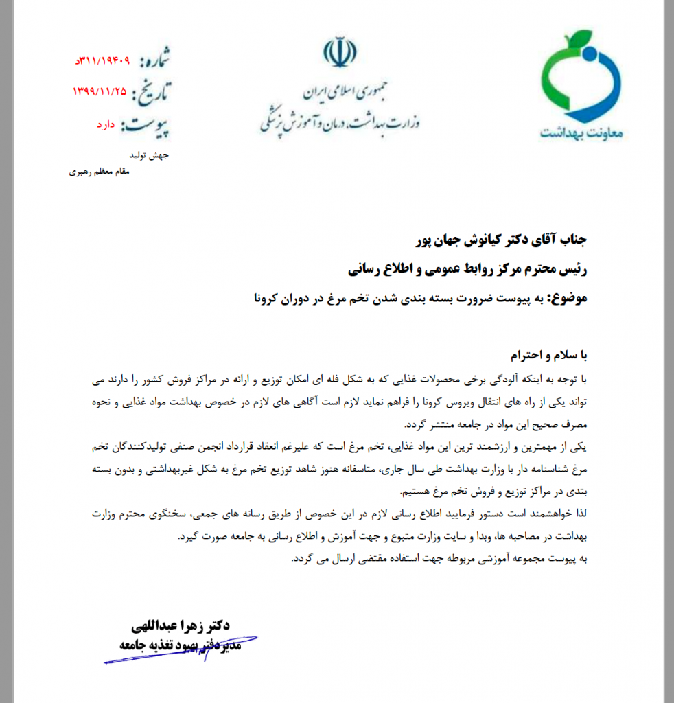 به گزارش پایگاه اطلاع رسانی کشاورزی و صنایع غذایی ایران (اگنا)؛ به پیوست نامهی اخیر معاونت بهداشت وزارت بهداشت، درمان و آموزش پزشکی مبنی بر آگاهی بخشی عموم جامعه نسبت به عرضه و مصرف بهداشتی و سلامت تخممرغ بویژه در شرایط فعلی که یکی از خطرناکترین و مسریترین ویروسهای تاریخ در بین تمام مردم شایع شده است و ابراز نگرانی نسبت به این موضوع که علیرغم تلاشهای پیشین برای عرضهی تخممرغ در بازار تنها بصورت بستهبندی و اثبات غیر بهداشتی بودن توزیع و مصرف این محصول بصورت فله که خود میتواند یکی از نقاط شیوع ویروس کرونا و دیگر ویروسها باشد؛ نکاتی موکدا در خصوص مصرف تخممرغ خطاب به عموم جامعه اطلاعرسانی میشود: