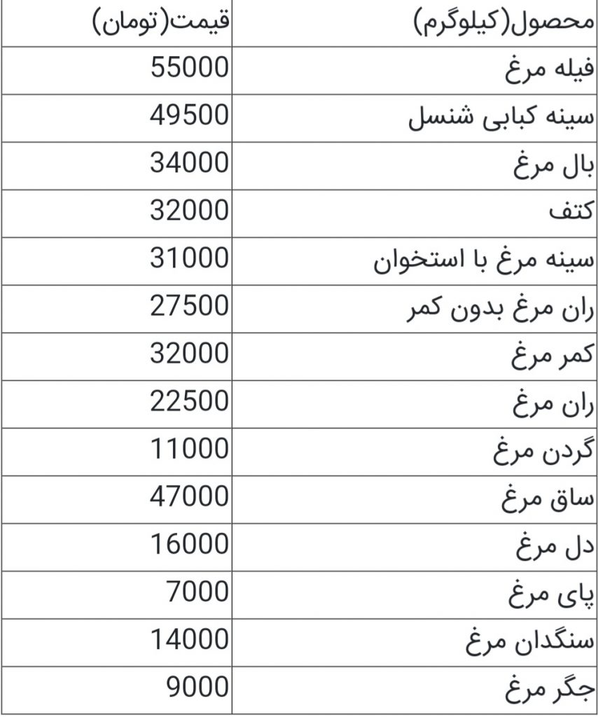 قیمت قطعات مرغ در یک فروشگاه بزرگ محصولات پروتئینی در منطقه ۱۹ تهران به این شرح است:
