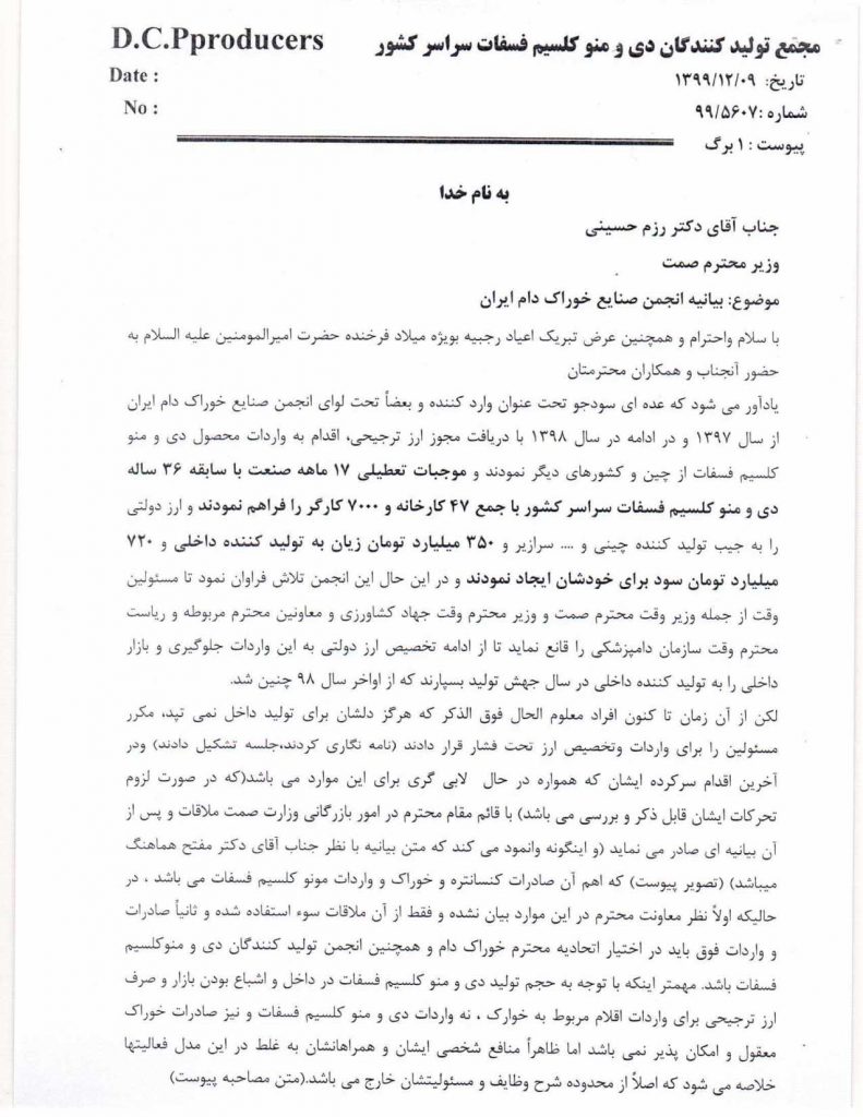 متن نامه دبیر مجمع تولیدکنندگان دی و منوکلسیم فسفات سراسر کشور به شرح ذیل می باشد: