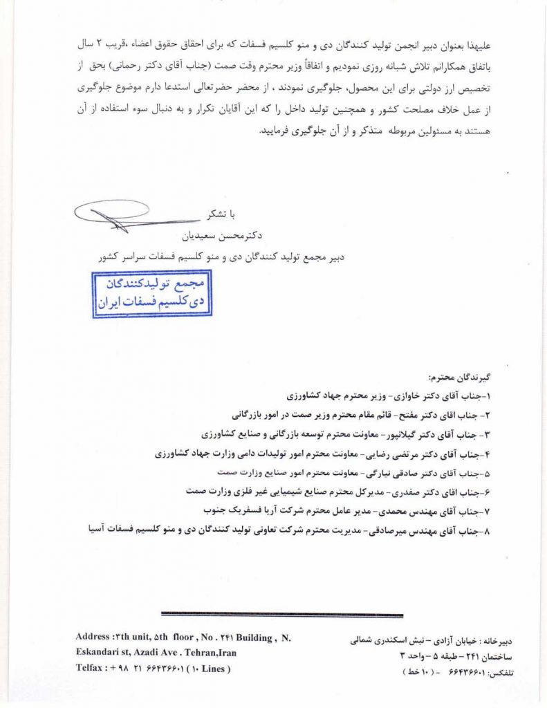 علیهذا، بهعنوان دبیر انجمن تولیدکنندگان دی و منوکلسیم فسفات که برای احقاق حقوق اعضاء، قریب ۲ سال بهاتفاق همکارانم تلاش شبانهروزی نمودیم و اتفاقاً وزیر محترم وقت صمت (جناب آقای دکتر رحمانی) بهحق از تخصیص ارز دولتی برای این محصول، جلوگیری نمودند.