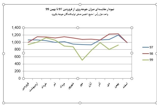 توضیح: متأثر از تحریم اجداد و مشکلات ارزی تأمین نهاده، تولید مرغ کشور در میانههای ۱۳۹۹، دچار اشکال جدی شد و در کل سال ۱۳۹۹ نیز نسبت به سال قبل از آن، کاهش داشته است (خط سبز رنگ). با این وجود، آمار جوجهریزی دی و بهمن (که جوجههای شب عید را تأمین میکند) نشان میدهد که اشکالات ناشی از تحریم تا حد زیادی ترمیم شده و کسری مقطعی بازار که ناشی از مصرف بیشتر در روزهای عید و ماه رمضان است، لاجرم باید از محل واردات تأمین شود. درحالیکه تبلیغات منتقدان، چنین به ذهن متبادر میکند که بخش اندکی از نیاز بازار تأمین شده و مابقی کسری است.